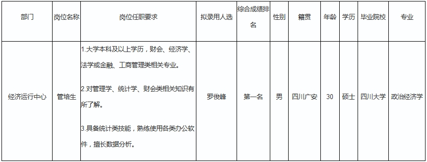 根據(jù)四川波鴻實業(yè)有限公司發(fā)布的招聘公告及招聘相關(guān)規(guī)定,經(jīng)面試綜合評估,擬錄用羅俊峰為經(jīng)濟運行中心管培生,現(xiàn)予以公示,具體情況如下: