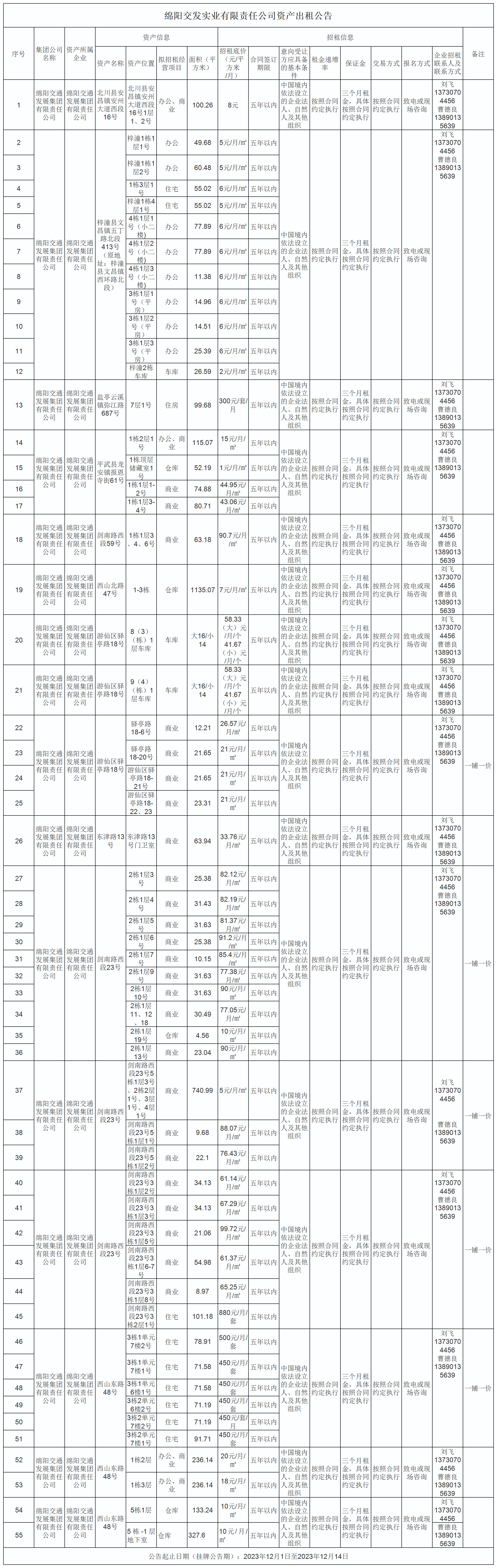 綿陽(yáng)交發(fā)實(shí)業(yè)有限責(zé)任公司現(xiàn)有部分經(jīng)營(yíng)性資產(chǎn)(商業(yè)門(mén)面、辦公樓、倉(cāng)庫(kù)及住房)對(duì)外公開(kāi)招租,資產(chǎn)位于綿陽(yáng)市涪城區(qū)、游仙區(qū)、梓潼、北川、鹽亭、平武等市、縣的中心地段,歡迎有意向的單位、個(gè)體工商戶、自然人報(bào)名競(jìng)價(jià),現(xiàn)將相關(guān)事宜公告如下: