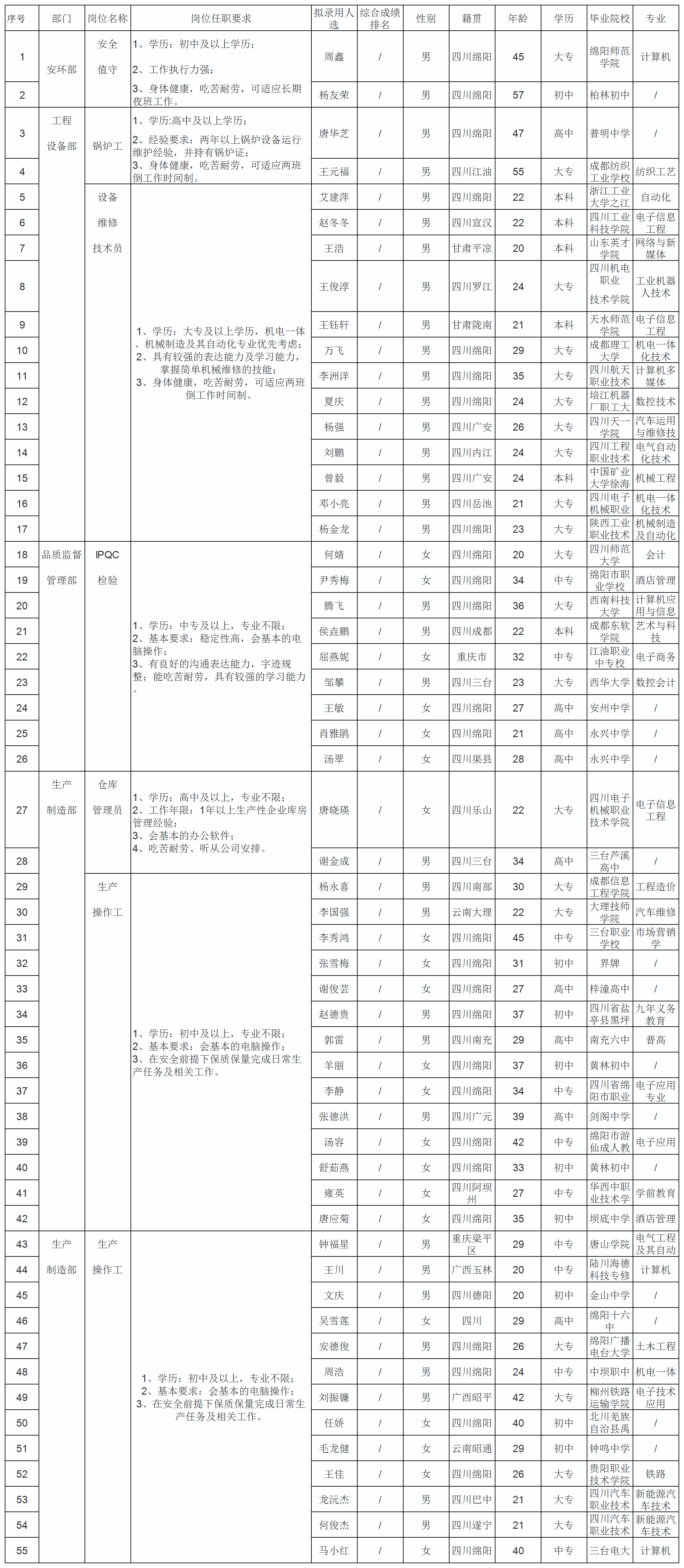 根據(jù)四川長虹杰創(chuàng)鋰電科技有限公司發(fā)布的招聘公告及招聘相關(guān)規(guī)定,經(jīng)面試、考察、體檢等程序,擬錄用周鑫等同志到四川長虹杰創(chuàng)鋰電科技有限公司工作,現(xiàn)予以公示,具體情況如下: