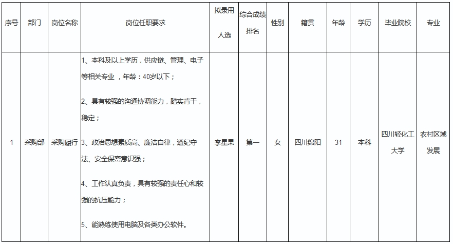 根據(jù)四川九州電子科技股份有限公司發(fā)布的招聘公告及招聘相關(guān)規(guī)定,經(jīng)筆試、面試、考察、體檢等程序,擬錄用李星果同志到四川九州電子科技股份有限公司工作,現(xiàn)予以公示,具體情況如下: