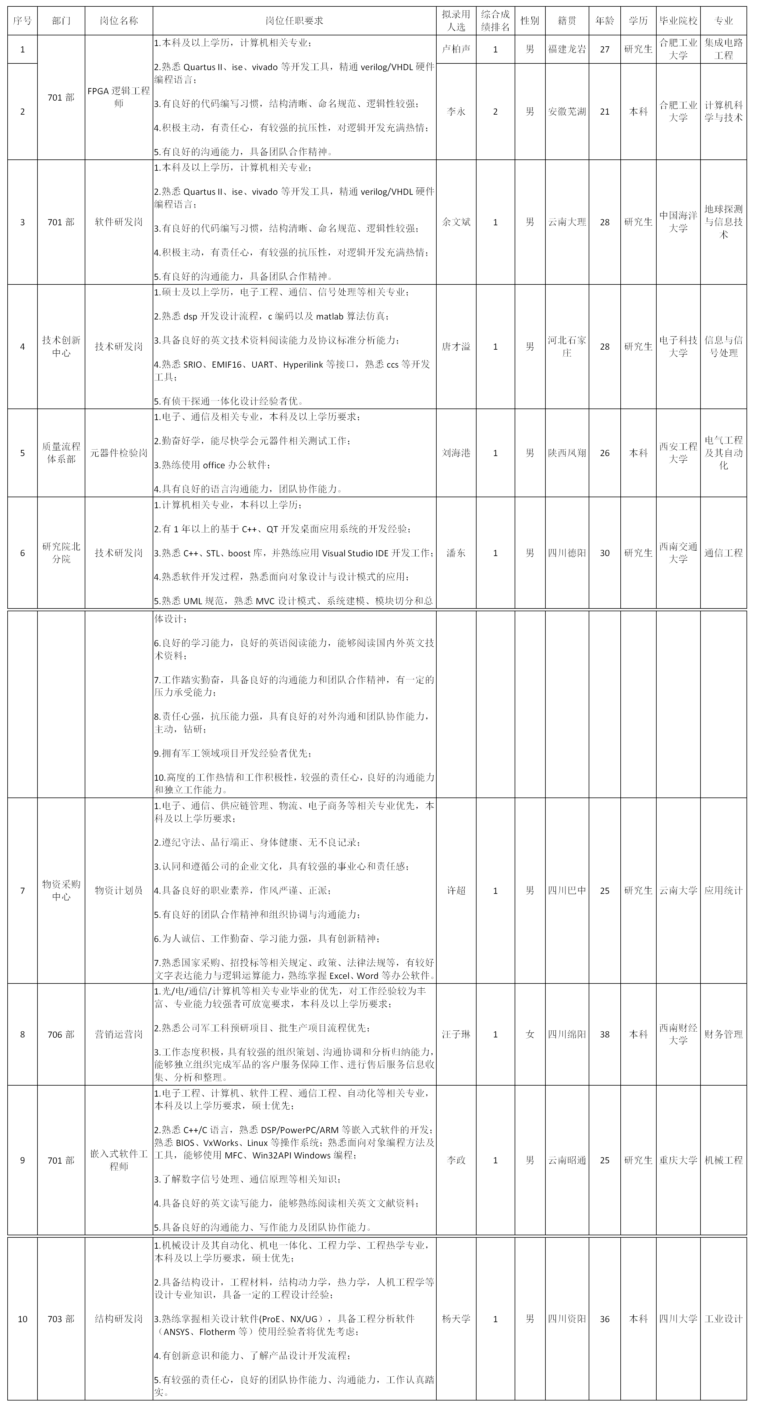 根據(jù)四川九洲電器集團有限責任公司發(fā)布的招聘公告及招聘相關(guān)規(guī)定,經(jīng)筆試、面試、考察、體檢等程序,擬錄用盧柏聲、李永等10位同志到四川九洲電器集團有限責任公司工作,現(xiàn)予以公示,具體情況如下: