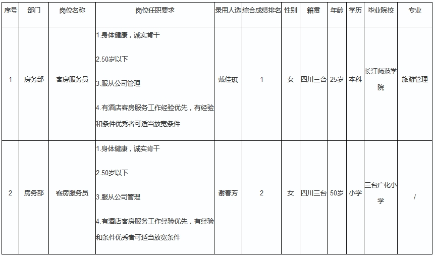 根據(jù)四川梓樂(lè)文化旅游開(kāi)發(fā)有限公司發(fā)布的招聘公告及招聘相關(guān)規(guī)定,經(jīng)面試、考察、體檢等程序,擬錄用戴佳琪、謝春芳兩位同志到梓州明宇麗雅酒店工作,現(xiàn)予以公示,具體情況如下: