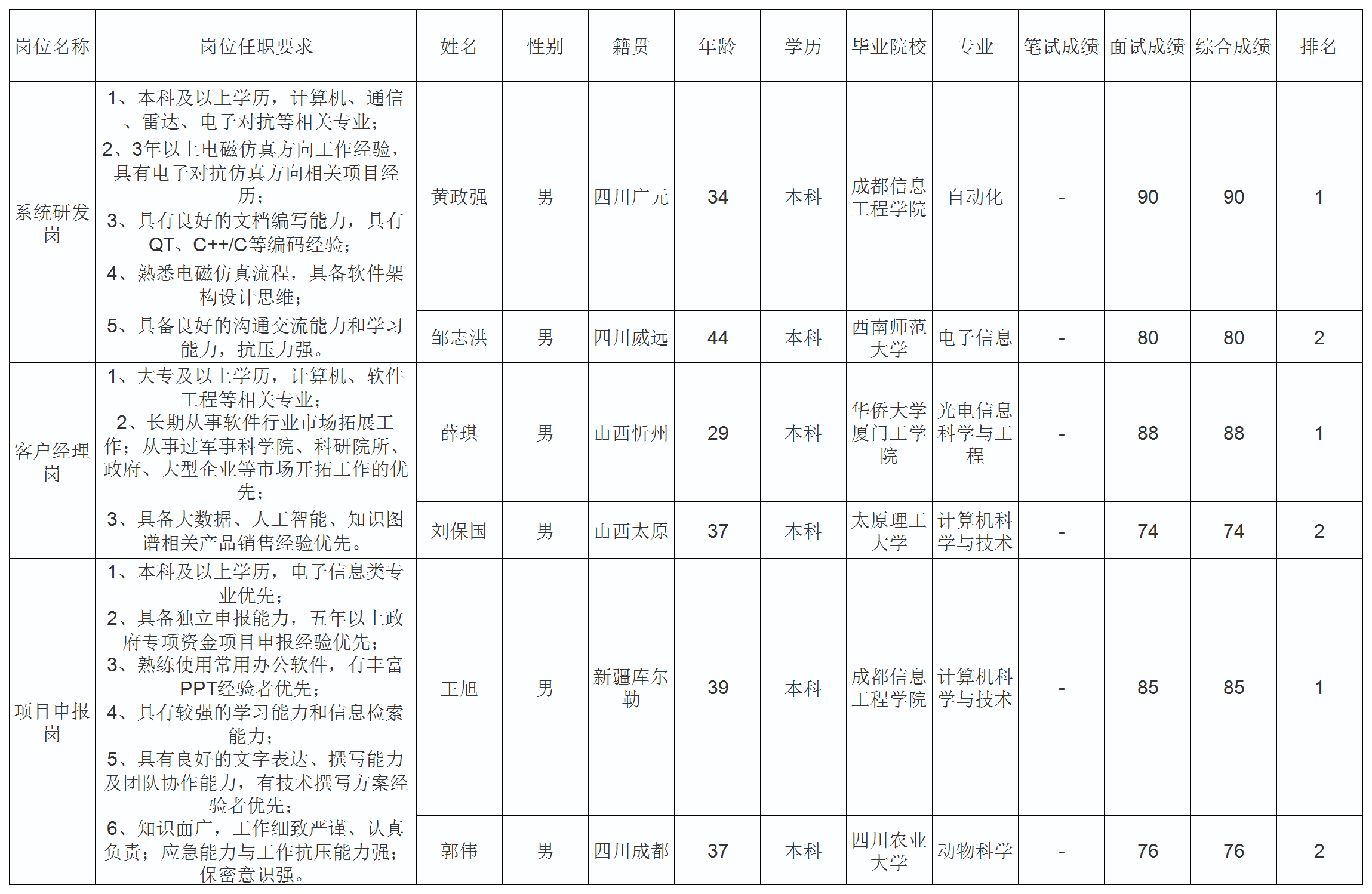 根據(jù)四川九洲軟件有限公司發(fā)布的招聘公告及招聘相關(guān)規(guī)定,經(jīng)筆試、面試等程序,現(xiàn)將筆試(面試)成績(jī)予以公示。