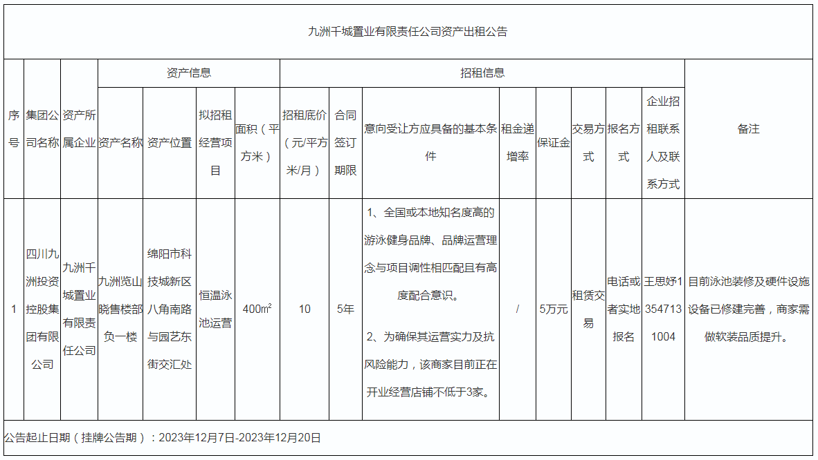九洲千城置業(yè)有限責(zé)任公司資產(chǎn)出租公告
