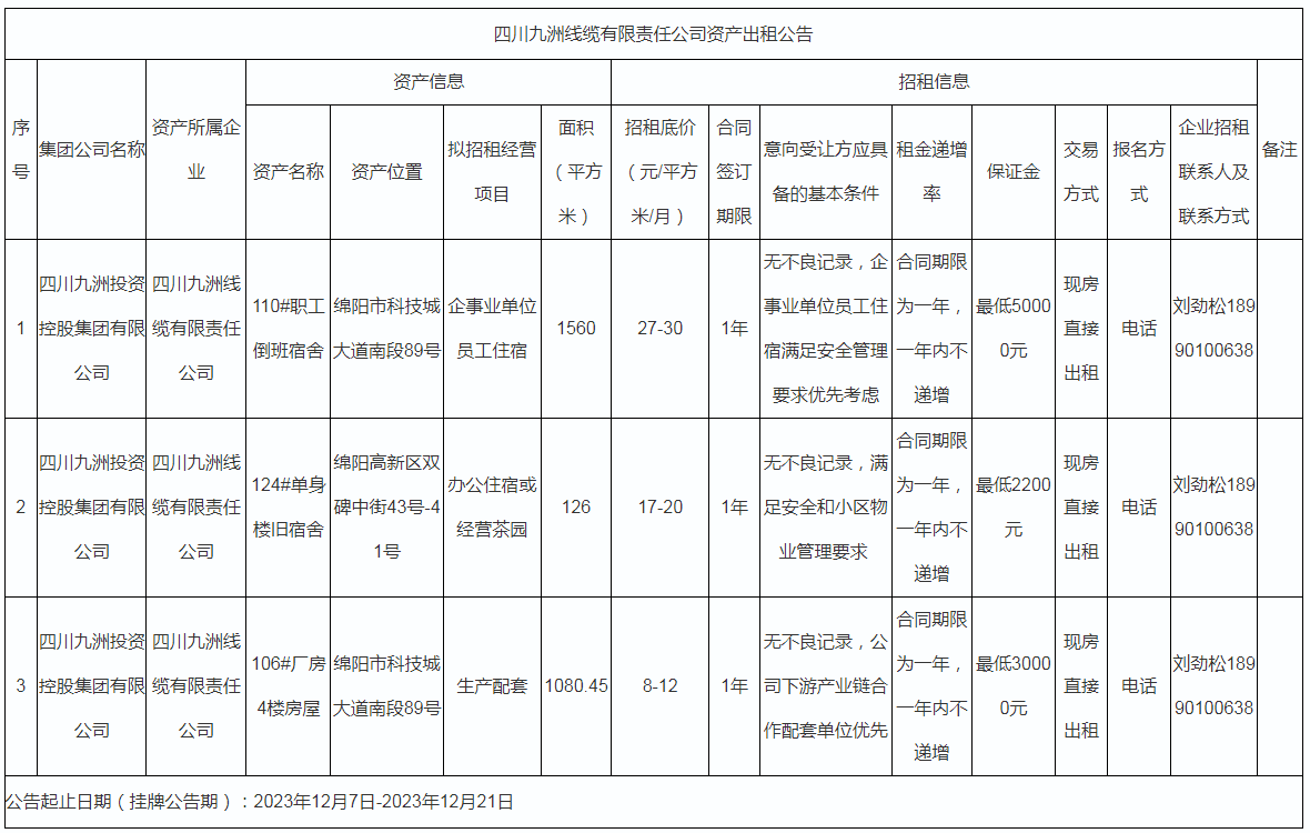 四川九洲線纜有限責任公司資產出租公告