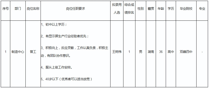 根據(jù)深圳市九洲光電科技有限公司發(fā)布的招聘公告及招聘相關(guān)規(guī)定,經(jīng)筆試、面試、考察、體檢等程序,擬錄用王樹偉同志到深圳市九洲光電科技有限公司工作,現(xiàn)予以公示,具體情況如下: