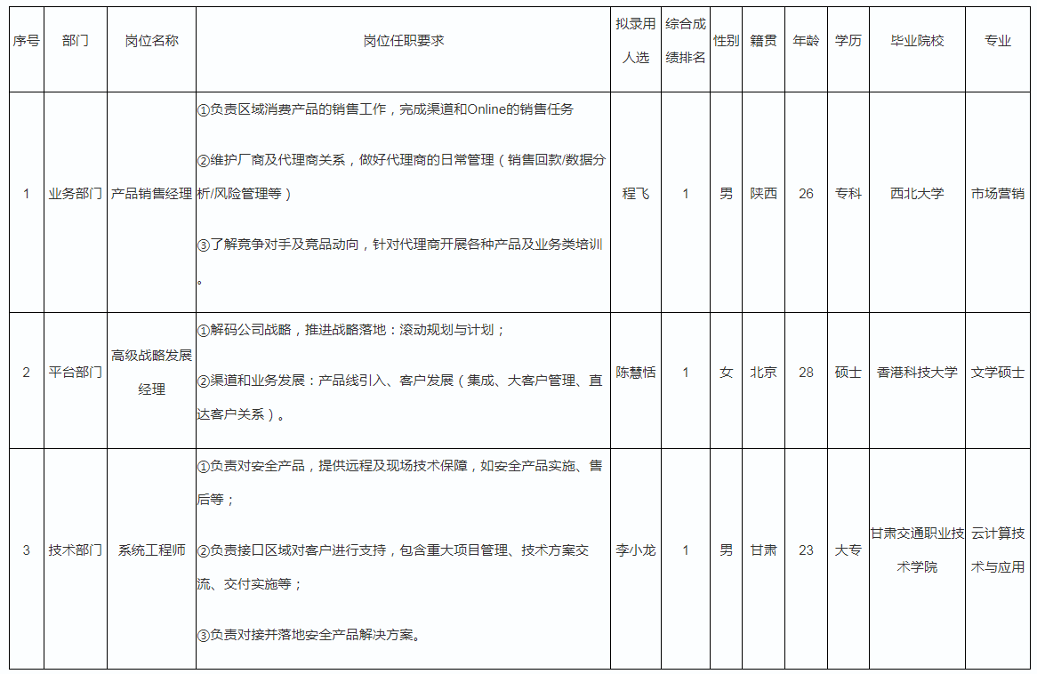 根據(jù)四川長虹佳華信息產(chǎn)品有限責(zé)任公司發(fā)布的招聘公告及招聘相關(guān)規(guī)定,經(jīng)筆試、面試、考察、體檢等程序,擬錄用程飛、陳慧恬、李小龍同志到四川長虹佳華信息產(chǎn)品有限責(zé)任公司工作,現(xiàn)予以公示,具體情況如下: