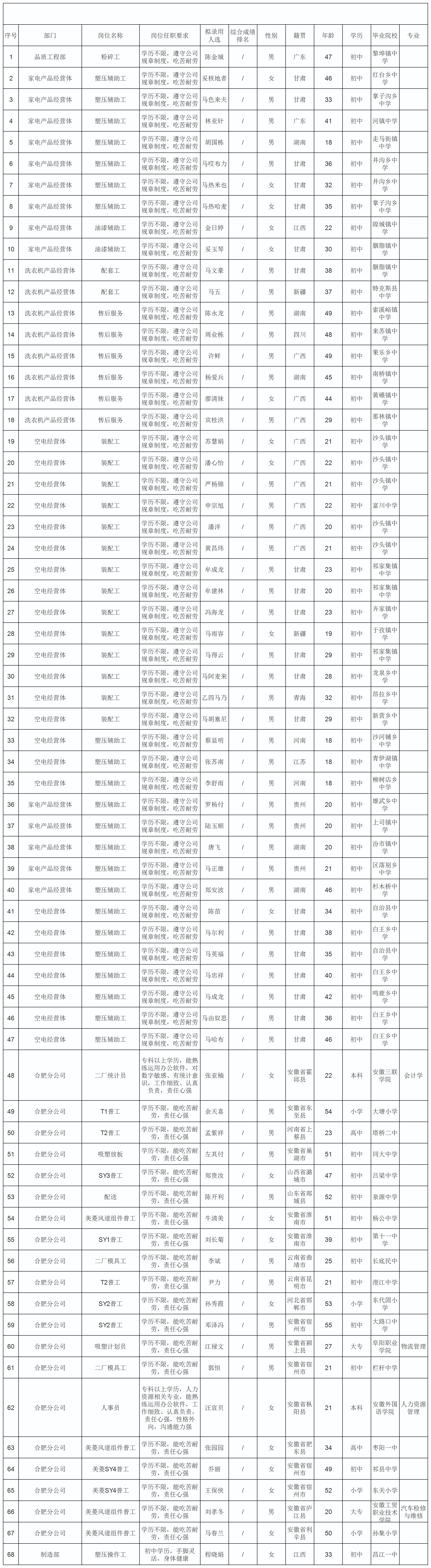 根據(jù)長虹模塑公司發(fā)布的招聘公告及招聘相關(guān)規(guī)定,經(jīng)筆試、面試、考察、體檢等程序,擬錄用68名同志到長虹模塑公司工作,現(xiàn)予以公示,具體情況如下: