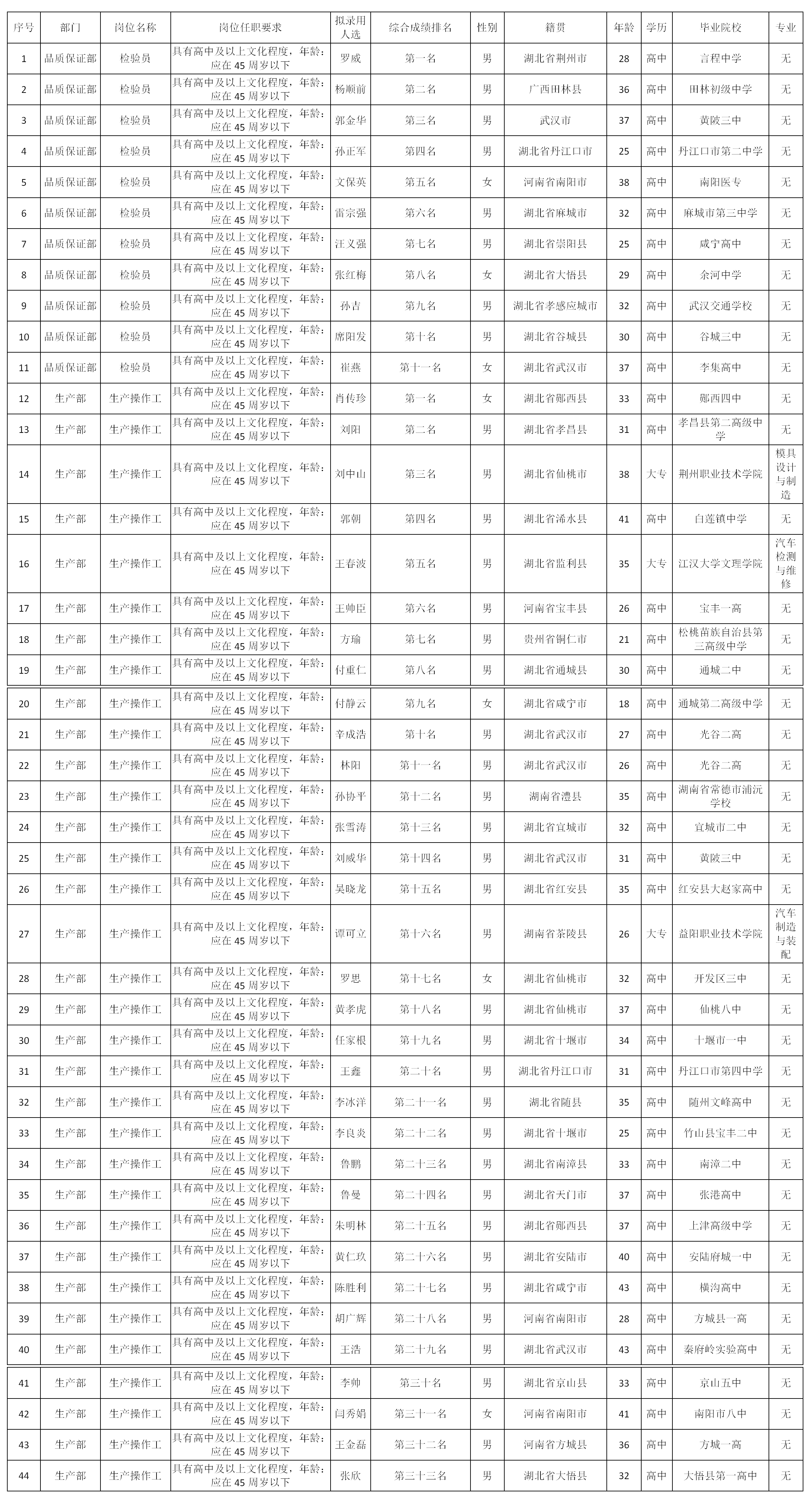 根據(jù)四川波鴻實(shí)業(yè)有限公司發(fā)布的招聘公告及招聘相關(guān)規(guī)定,經(jīng)面試、體檢等程序,擬錄用以下人員到威斯卡特工業(yè)(中國)有限公司一線崗位工作,現(xiàn)予以公示,具體情況如下: