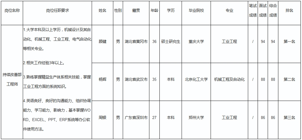 根據(jù)四川波鴻實業(yè)有限公司發(fā)布的招聘公告及招聘相關(guān)規(guī)定,經(jīng)面試,現(xiàn)將威斯卡特工業(yè)(中國)有限公司持續(xù)改善部工程師成績予以公示。
