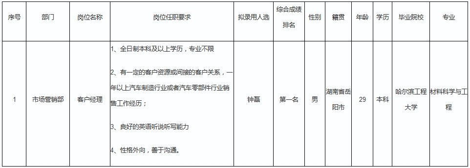 根據(jù)四川波鴻實(shí)業(yè)有限公司發(fā)布的招聘公告及招聘相關(guān)規(guī)定,經(jīng)面試、考察、體檢等程序,擬錄用鐘磊為威斯卡特工業(yè)(中國)有限公司客戶經(jīng)理,現(xiàn)予以公示,具體情況如下: