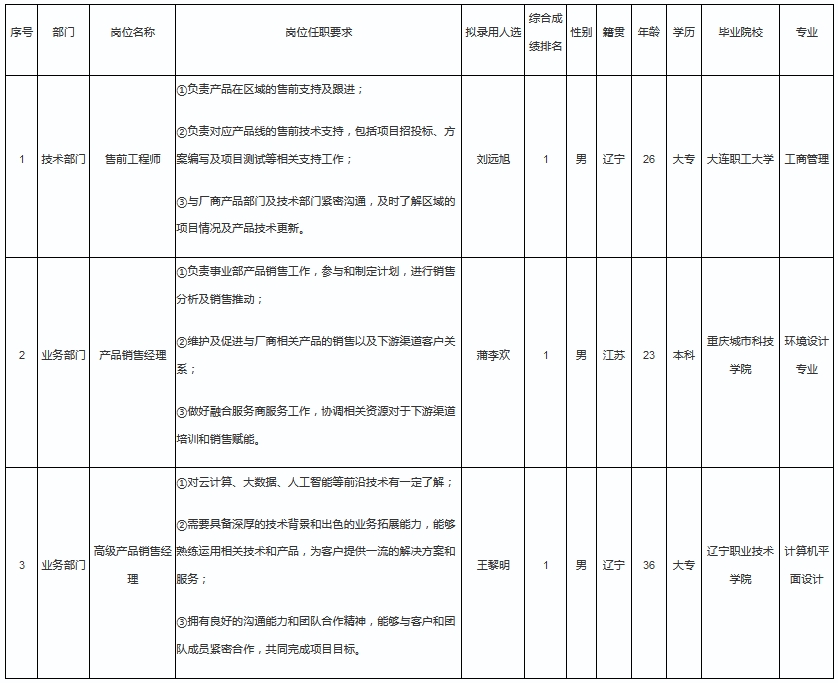 根據(jù)四川長虹佳華信息產(chǎn)品有限責任公司發(fā)布的招聘公告及招聘相關規(guī)定,經(jīng)筆試、面試、考察、體檢等程序,擬錄用劉遠旭、蒲李歡、王黎明同志到四川長虹佳華信息產(chǎn)品有限責任公司工作,現(xiàn)予以公示,具體情況如下: