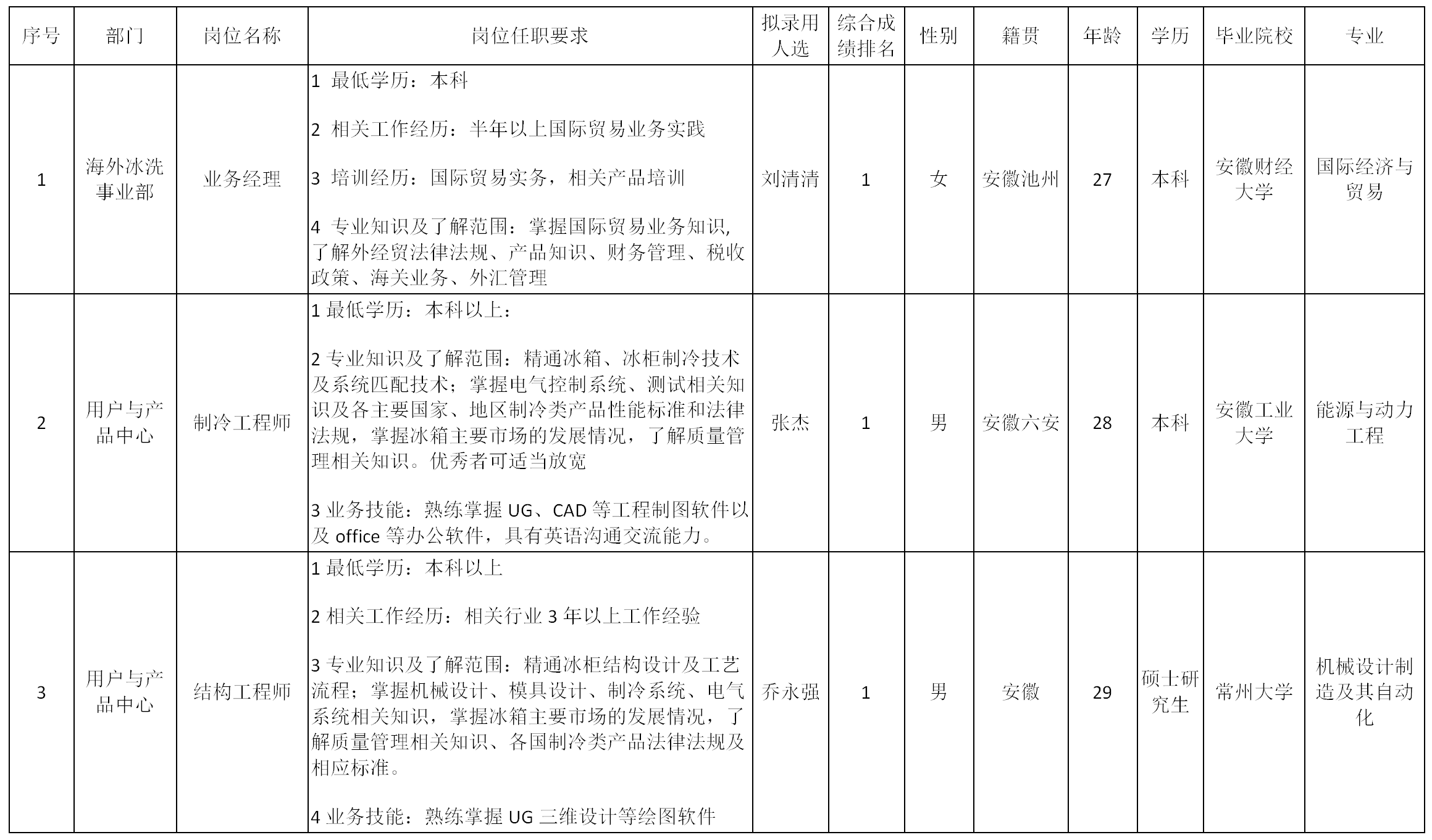 根據(jù)長(zhǎng)虹美菱股份有限公司發(fā)布的招聘公告及招聘相關(guān)規(guī)定,經(jīng)面試、體檢等程序,擬錄用劉清清同志到海外冰洗事業(yè)部部門(mén)工作,現(xiàn)予以公示,具體情況如下: