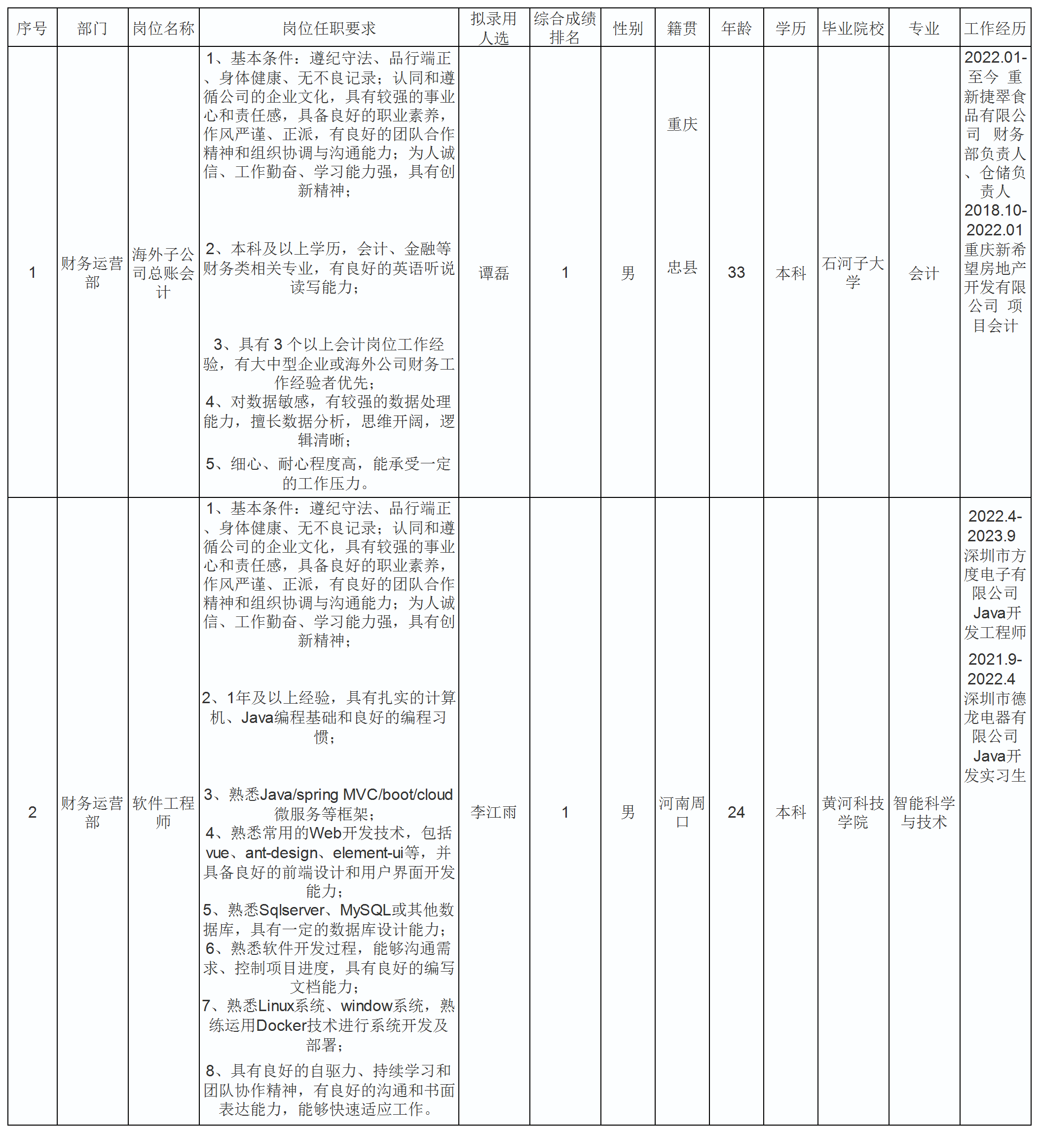 根據(jù)長(zhǎng)虹·美菱國(guó)際區(qū)品牌運(yùn)營(yíng)中心發(fā)布的招聘公告及招聘相關(guān)規(guī)定,經(jīng)面試、考察、體檢等程序,擬錄用譚磊、李江雨同志到財(cái)務(wù)運(yùn)營(yíng)部工作,現(xiàn)予以公示,具體情況如下: