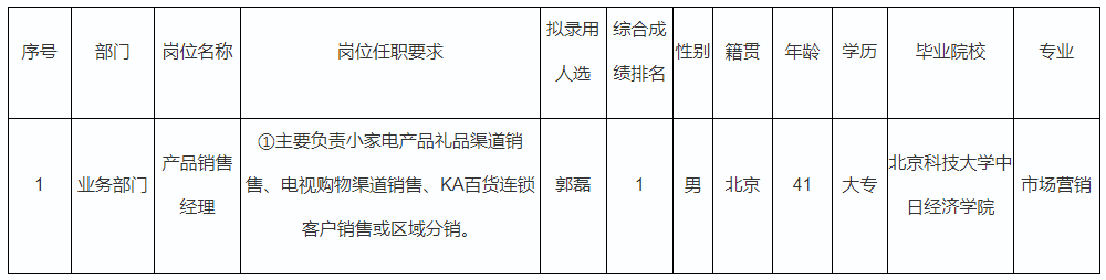 根據(jù)四川長虹佳華信息產(chǎn)品有限責(zé)任公司發(fā)布的招聘公告及招聘相關(guān)規(guī)定,經(jīng)筆試、面試、考察、體檢等程序,擬錄用郭磊同志到四川長虹佳華信息產(chǎn)品有限責(zé)任公司工作,現(xiàn)予以公示,具體情況如下: