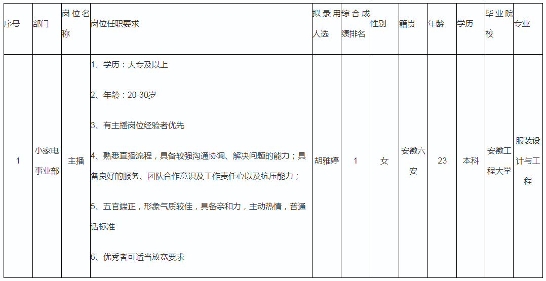 根據(jù)公司經(jīng)營(yíng)管理需要,小家電事業(yè)部招聘主播崗位1人,經(jīng)簡(jiǎn)歷篩選、面試、體檢等程序,胡雅婷滿(mǎn)足錄用條件,現(xiàn)予以公示。