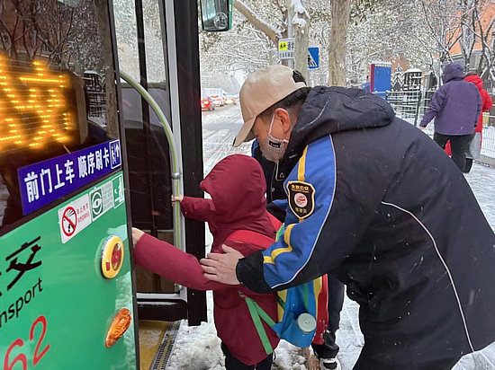 司乘人員護(hù)送小乘客登上北京通學(xué)公交車(chē)。(北京公交集團(tuán)供圖)