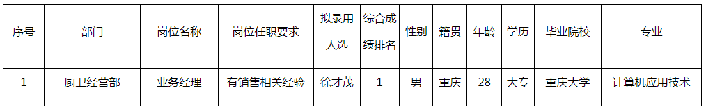 根據(jù)合肥長虹美菱生活電器有限公司發(fā)布的招聘公告及招聘相關(guān)規(guī)定,經(jīng)面試、體檢等程序,擬錄用徐才茂同志到合肥長虹美菱生活電器有限公司工作,現(xiàn)予以公示,具體情況如下:
