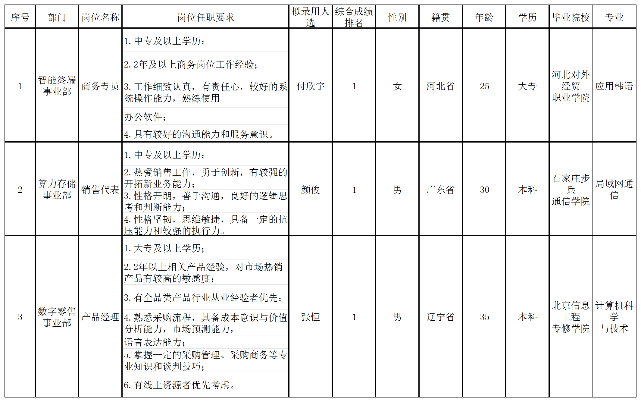 根據(jù)北京九洲科瑞科技有限公司發(fā)布的招聘公告及招聘相關(guān)規(guī)定,經(jīng)筆試、面試、考察、體檢等程序,擬錄用付欣宇、顏俊、張恒同志到公司工作,現(xiàn)予以公示,具體情況如下: