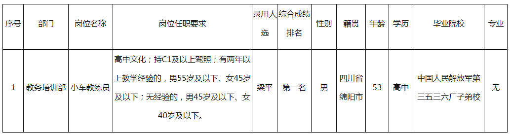 根據(jù)綿陽(yáng)公交好運(yùn)駕駛技術(shù)培訓(xùn)有限公司發(fā)布的招聘公告及招聘相關(guān)規(guī)定,經(jīng)面試、體檢等程序,錄用梁平為教務(wù)培訓(xùn)部小車教練員,現(xiàn)予以公示,具體情況如下: