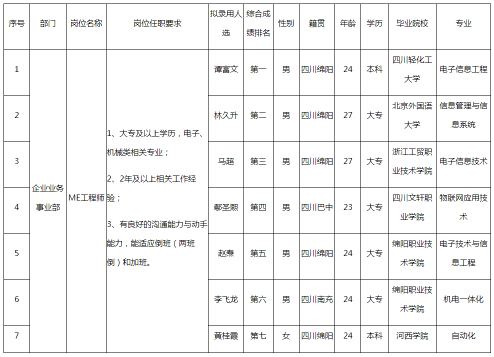 根據(jù)四川九州電子科技股份有限公司發(fā)布的招聘公告及招聘相關(guān)規(guī)定,經(jīng)筆試、面試、考察、體檢等程序,擬錄用譚富文等7名同志到四川九州電子科技股份有限公司工作,現(xiàn)予以公示,具體情況如下: