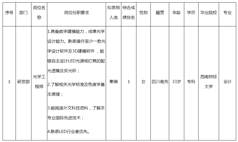 根據(jù)四川九洲光電科技股份有限公司發(fā)布的招聘公告及招聘相關(guān)規(guī)定,經(jīng)筆試、面試、考察、體檢等程序,擬錄用秦娟同志到光學(xué)工程師崗位工作,現(xiàn)予以公示,具體情況如下: