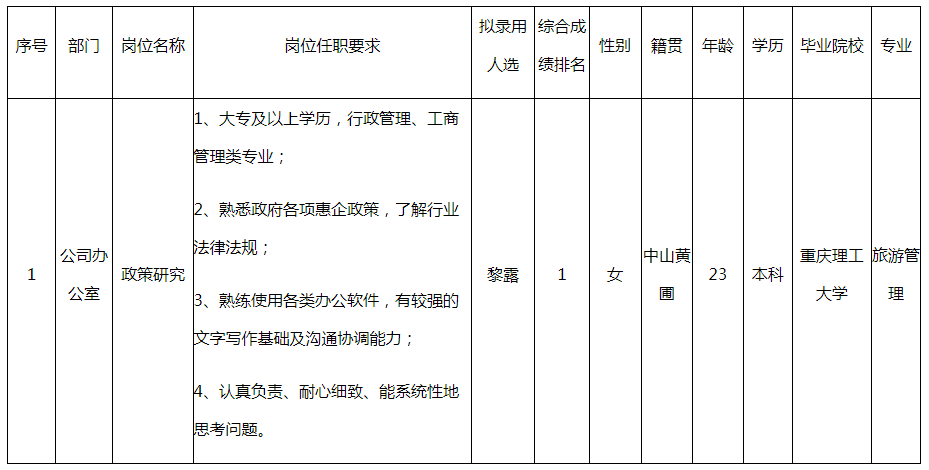 根據(jù)廣東長(zhǎng)虹電子有限公司發(fā)布的招聘公告及招聘相關(guān)規(guī)定,經(jīng)面試、考察、體檢等程序,擬錄用黎露同志到公司辦公室工作,現(xiàn)予以公示,具體情況如下: