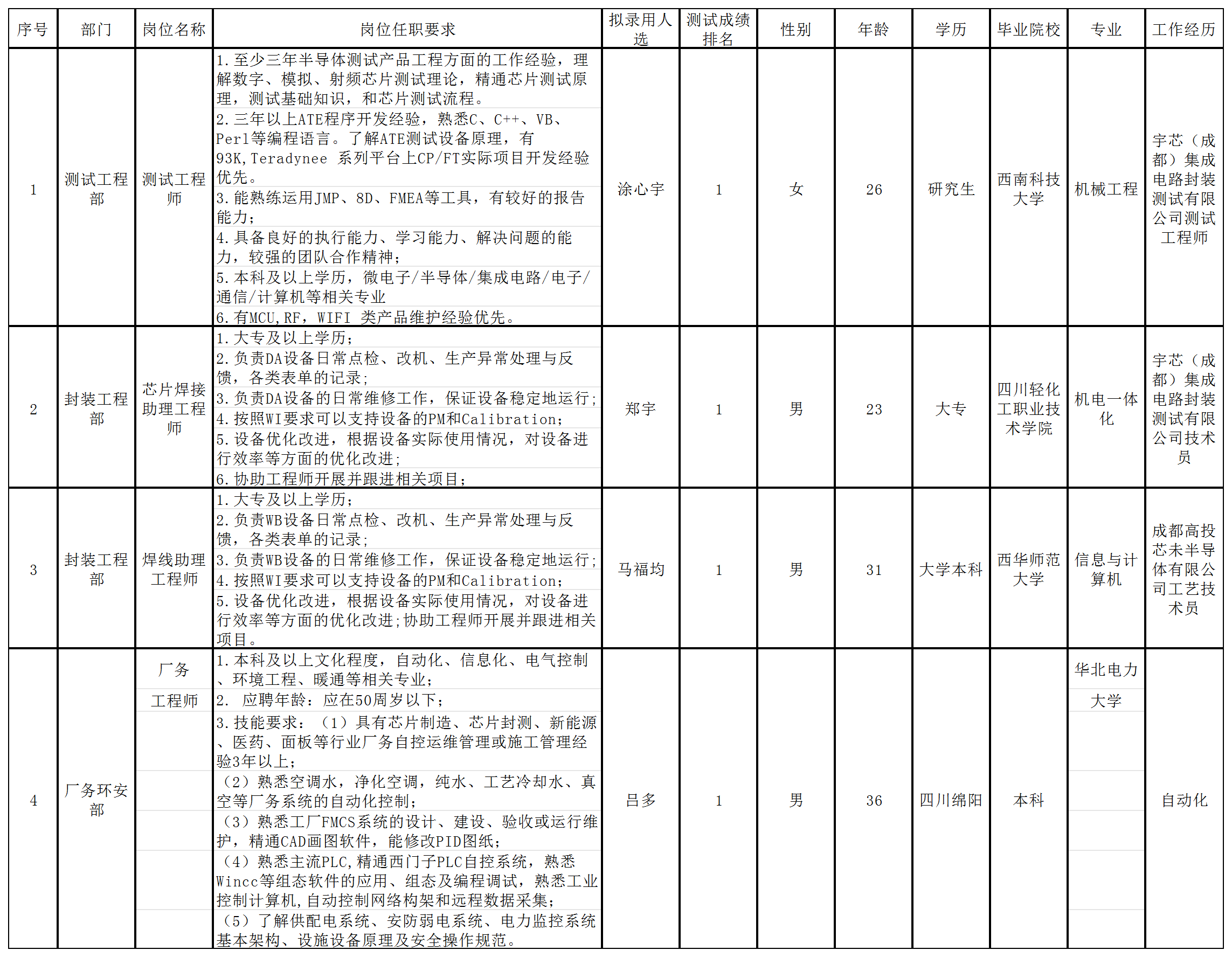 根據(jù)四川啟賽微電子有限公司發(fā)布的招聘公告及招聘相關(guān)規(guī)定,經(jīng)用人單位面試,擬錄用以下同志到相應(yīng)崗位工作,現(xiàn)予以公示,具體情況如下: