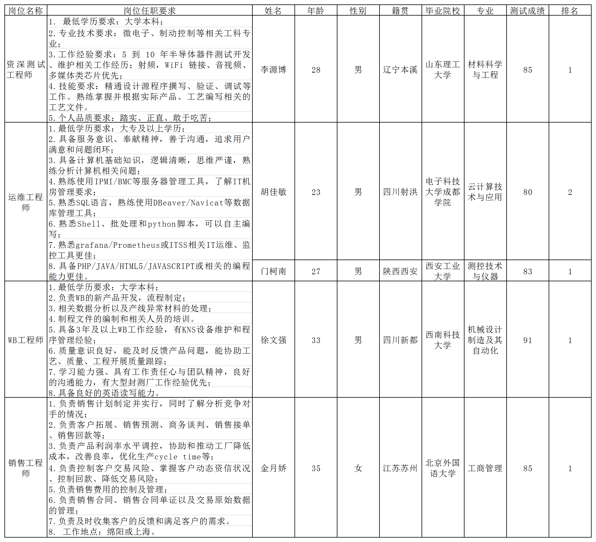根據(jù)四川啟賽微電子有限公司發(fā)布的招聘公告及招聘相關(guān)規(guī)定,經(jīng)用人單位面試程序,現(xiàn)將測試合格人員予以公示。