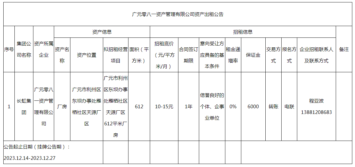廣元零八一資產(chǎn)管理有限公司資產(chǎn)出租公告