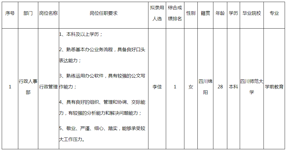 根據(jù)四川長(zhǎng)虹空調(diào)有限公司發(fā)布的招聘公告及招聘相關(guān)規(guī)定,經(jīng)面試、考察、體檢等程序,擬錄用李佳到長(zhǎng)虹空調(diào)工作,現(xiàn)予以公示,具體情況如下: