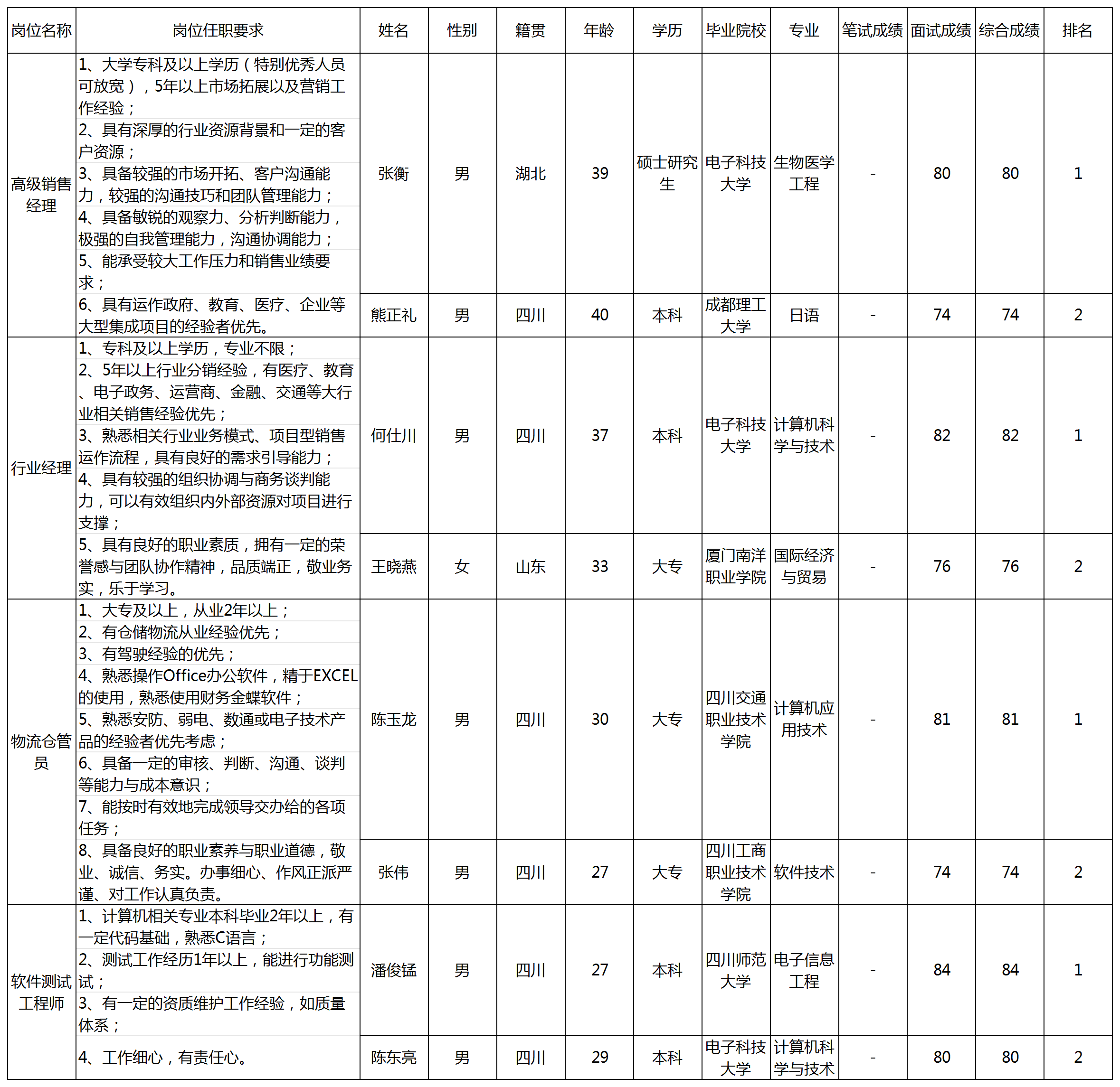 根據(jù)四川科瑞軟件有限責(zé)任公司發(fā)布的招聘公告及招聘相關(guān)規(guī)定,經(jīng)筆試、面試等程序,現(xiàn)將筆試(面試)成績予以公示。