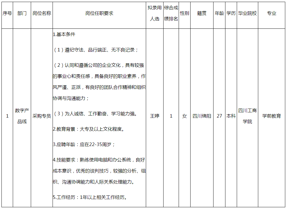 根據(jù)四川九州光電子技術(shù)有限公司發(fā)布的招聘公告及招聘相關(guān)規(guī)定,經(jīng)面試、考察、體檢等程序,擬錄用王婷同志到四川九州光電子技術(shù)有限公司工作,現(xiàn)予以公示,具體情況如下: