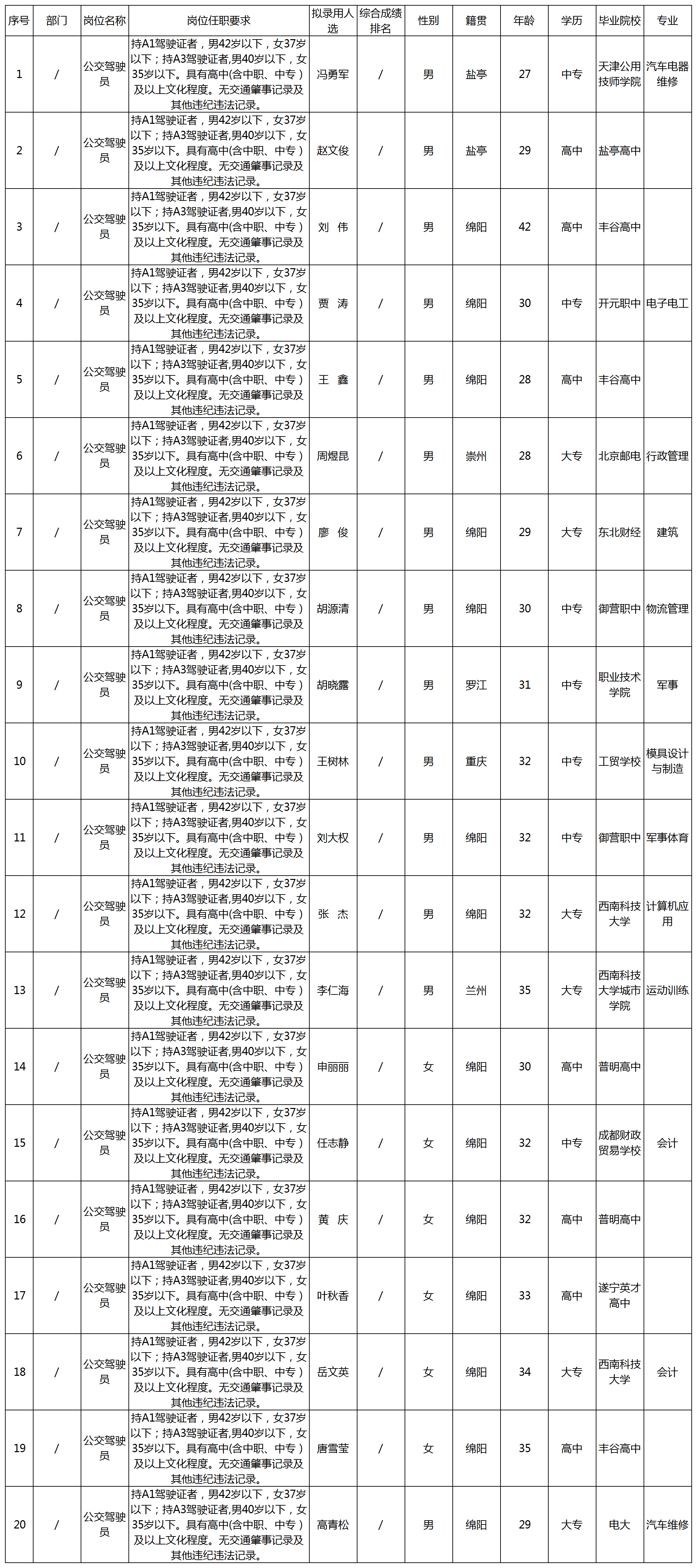 根據(jù)公交集團發(fā)布的招聘公告及招聘相關(guān)規(guī)定,經(jīng)考察、體檢等程序,擬錄用馮勇軍等同志到公交集團工作,現(xiàn)予以公示,具體情況如下: