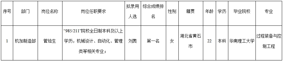 根據(jù)四川波鴻實(shí)業(yè)有限公司發(fā)布的招聘公告及招聘相關(guān)規(guī)定,經(jīng)面試、考察、體檢等程序,擬錄用以下人員為威斯卡特工業(yè)(中國(guó))有限公司管培生,現(xiàn)予以公示,具體情況如下: