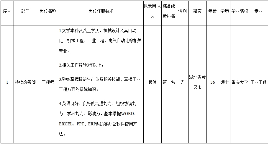 根據(jù)四川波鴻實(shí)業(yè)有限公司發(fā)布的招聘公告及招聘相關(guān)規(guī)定,經(jīng)面試、考察、體檢等程序,擬錄用顧健為威斯卡特工業(yè)(中國(guó))有限公司持續(xù)改善部工程師,現(xiàn)予以公示,具體情況如下: