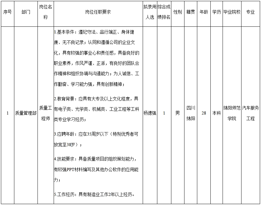 根據(jù)四川九華光子通信技術(shù)有限公司發(fā)布的招聘公告及招聘相關(guān)規(guī)定,經(jīng)面試、考察、體檢等程序,擬錄用楊德強(qiáng)同志到四川九華光子通信技術(shù)有限公司工作,現(xiàn)予以公示,具體情況如下: