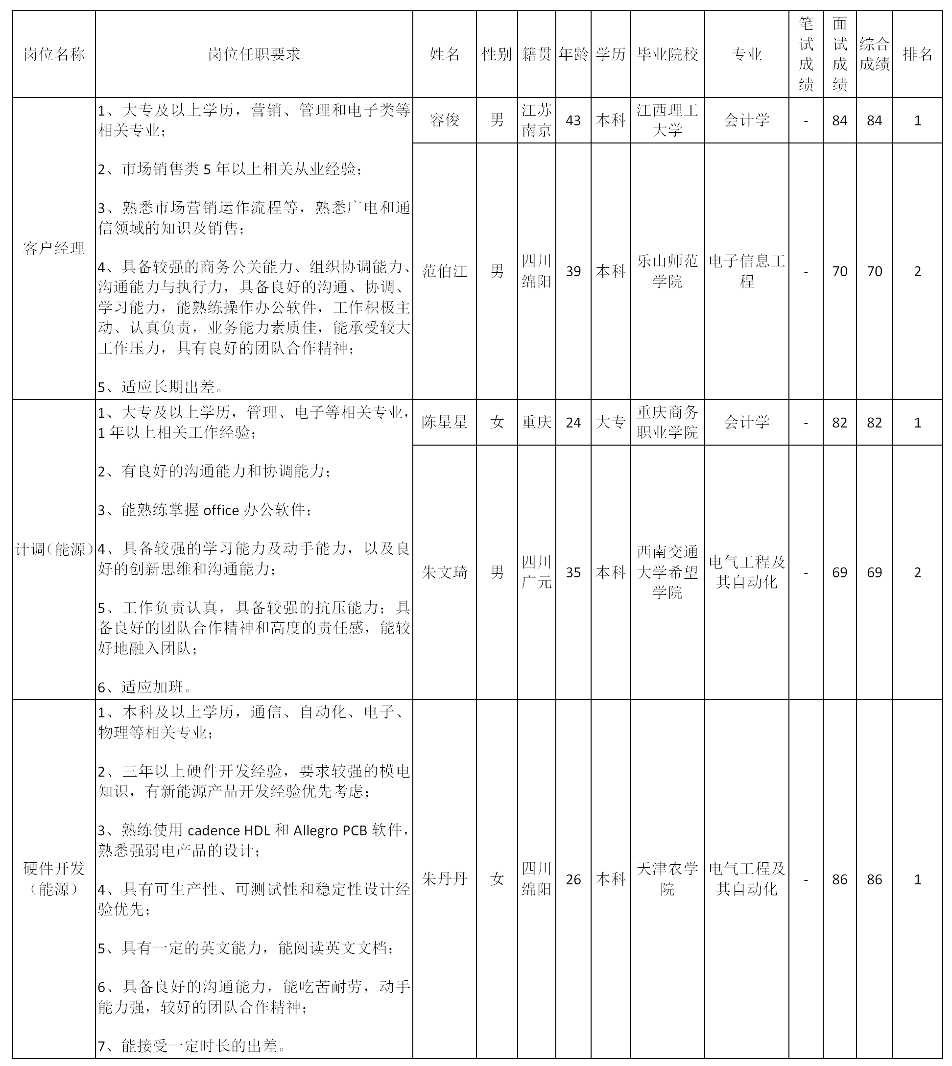 根據(jù)四川九州電子科技股份有限公司發(fā)布的招聘公告及招聘相關(guān)規(guī)定,經(jīng)筆試、面試等程序,現(xiàn)將筆試(面試)成績予以公示。