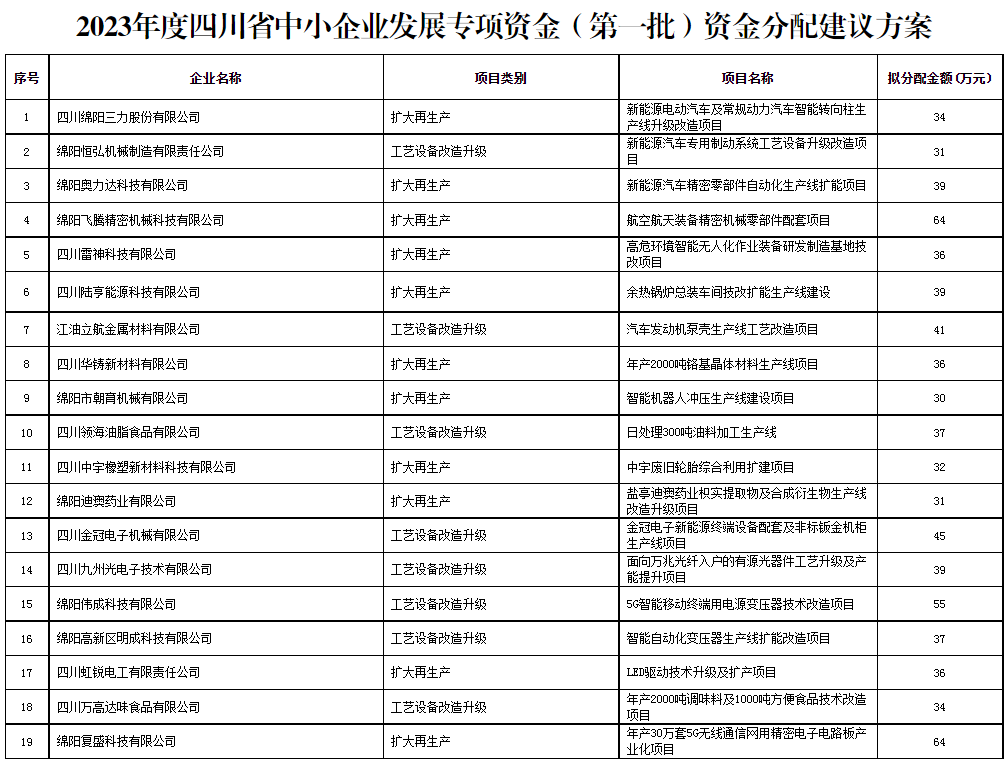 根據(jù)市經(jīng)信局《關(guān)于做好2023年度四川省中小企業(yè)發(fā)展專項(xiàng)資金(第一批)申報(bào)工作的通知》(綿經(jīng)信企業(yè)〔2023〕578號(hào))要求,通過企業(yè)自主申報(bào),縣(市、區(qū))、園區(qū)工業(yè)經(jīng)濟(jì)主管部門初審?fù)扑],經(jīng)相關(guān)科室審核、專家評(píng)審、現(xiàn)場(chǎng)核查和市經(jīng)信局黨組會(huì)審議等程序?,F(xiàn)對(duì)擬支持的19家企業(yè)(項(xiàng)目)名單予以公示。
