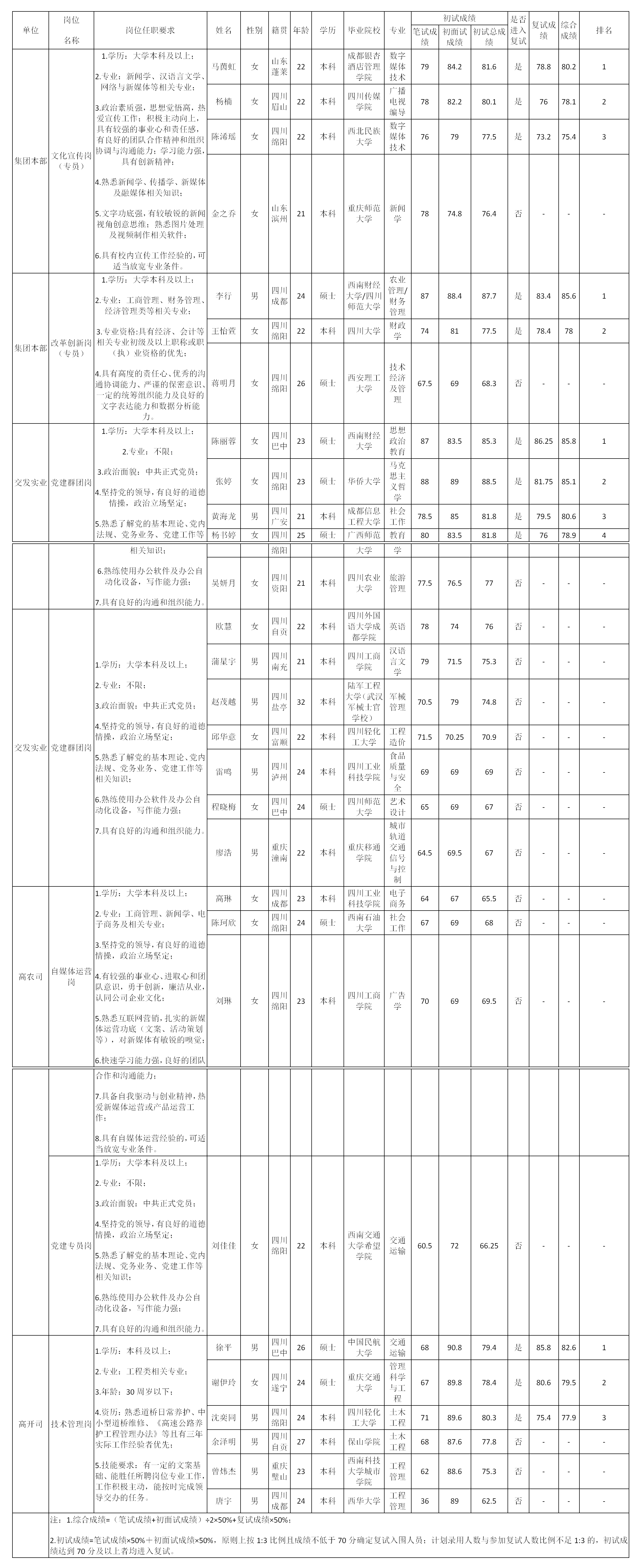 根據(jù)交發(fā)集團發(fā)布的招聘公告及招聘相關(guān)規(guī)定,經(jīng)資格審查、筆試、面試等程序,現(xiàn)將成績予以公示。