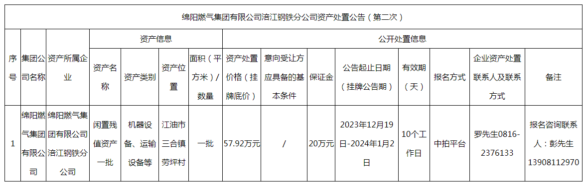 綿陽燃氣集團有限公司涪江鋼鐵分公司資產(chǎn)處置公告(第二次)