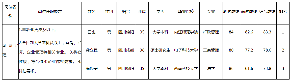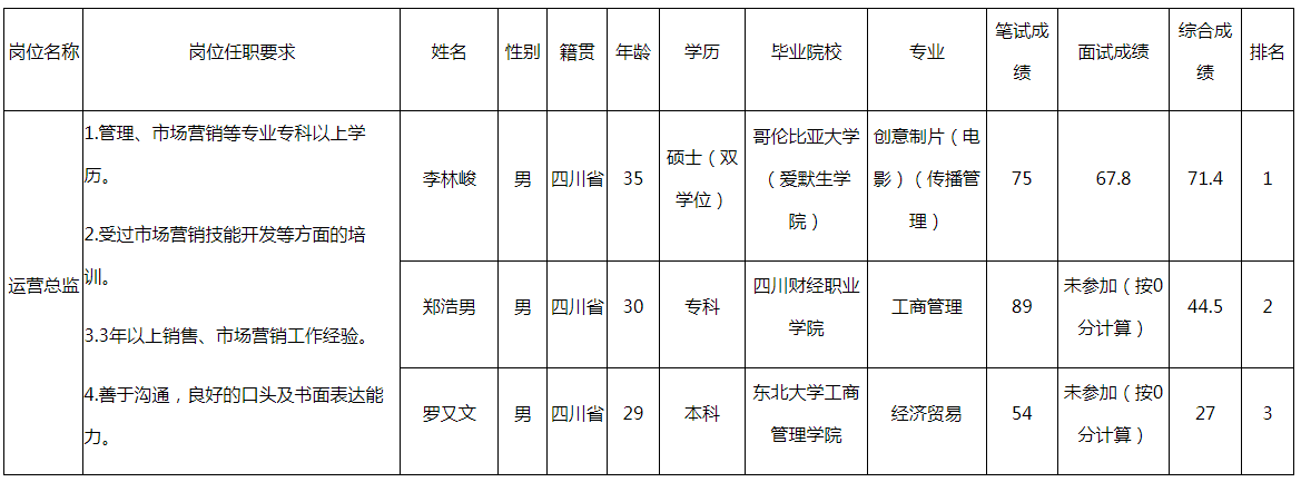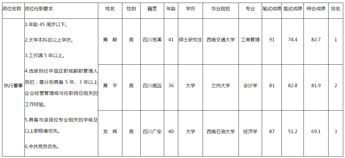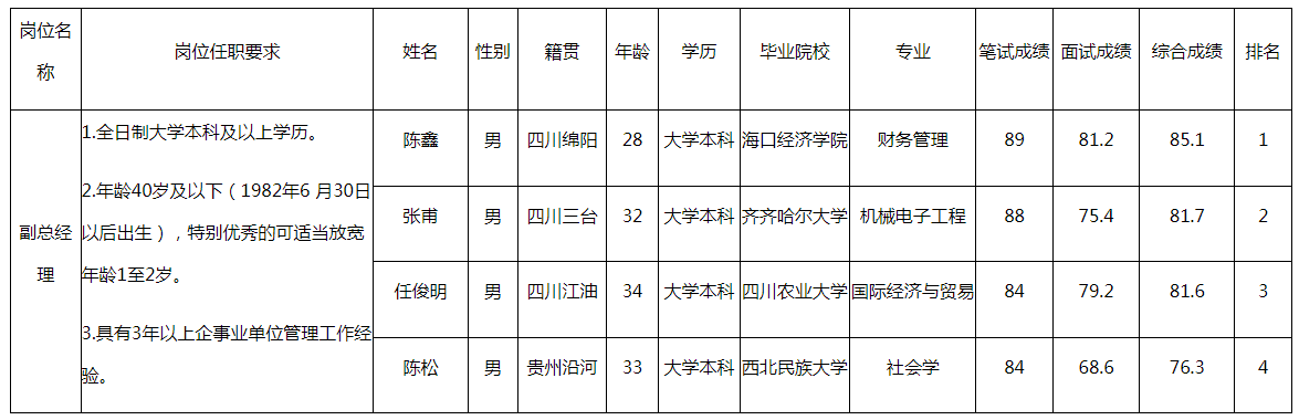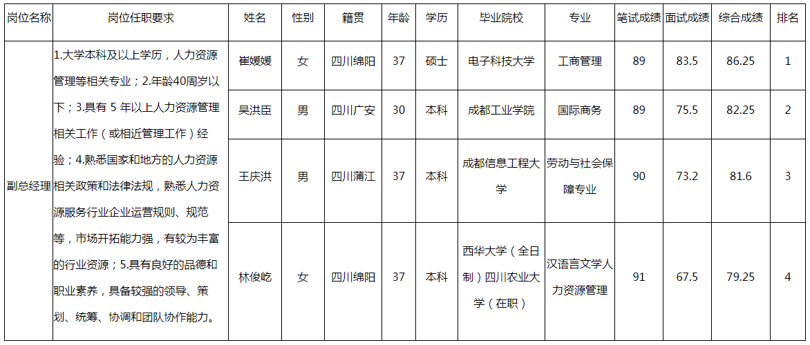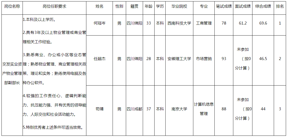 根據(jù)綿陽市國資委發(fā)布的面向全國選聘20名國企經(jīng)營管理人員的公告及相關規(guī)定,對11個達到開考比例的崗位應聘人員組織能力測試、面試(另有9個崗位未達到開考比例終止競聘),現(xiàn)將各應聘人員成績予以公示。