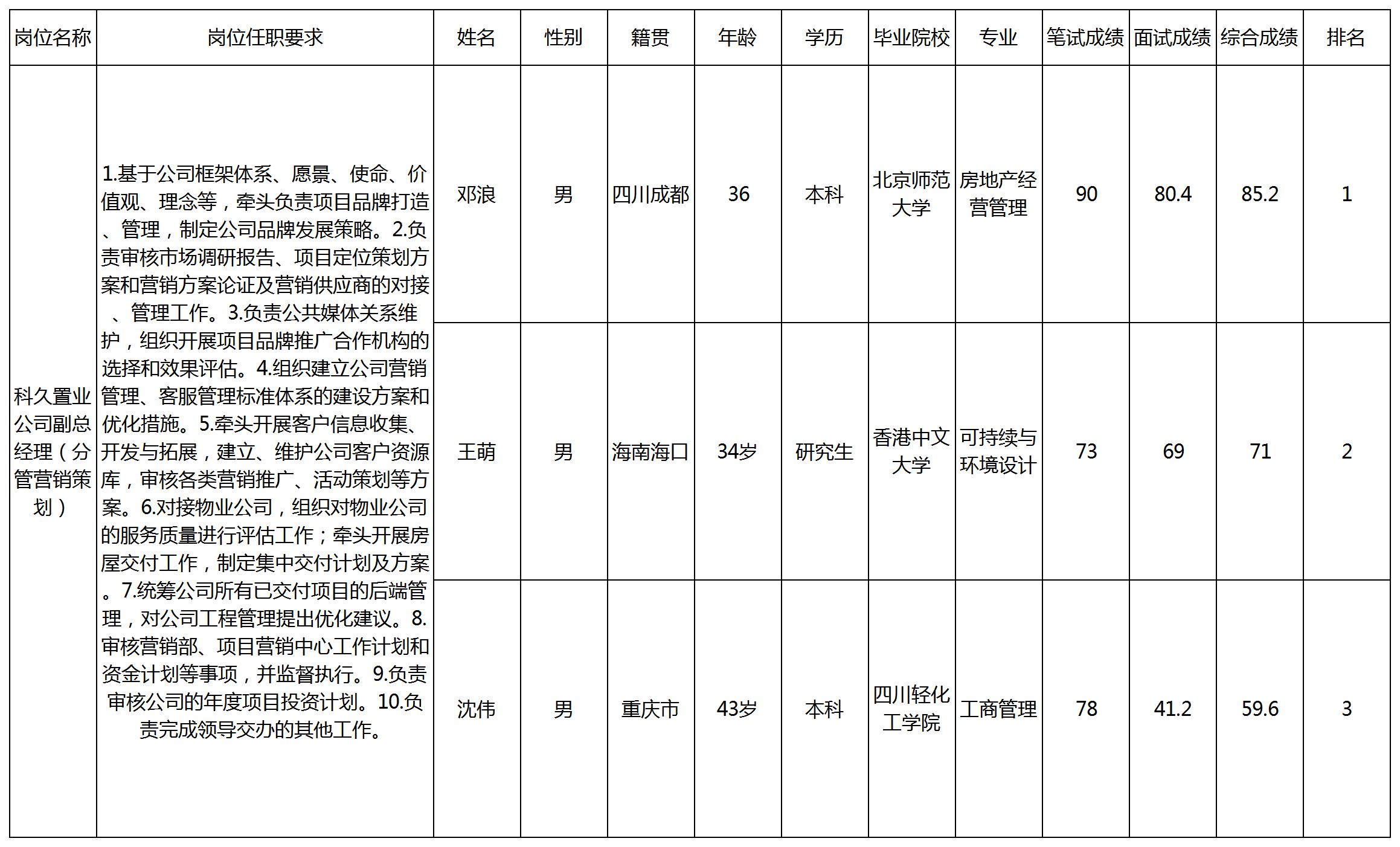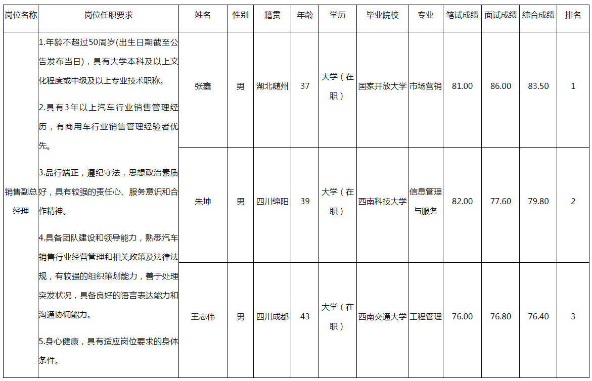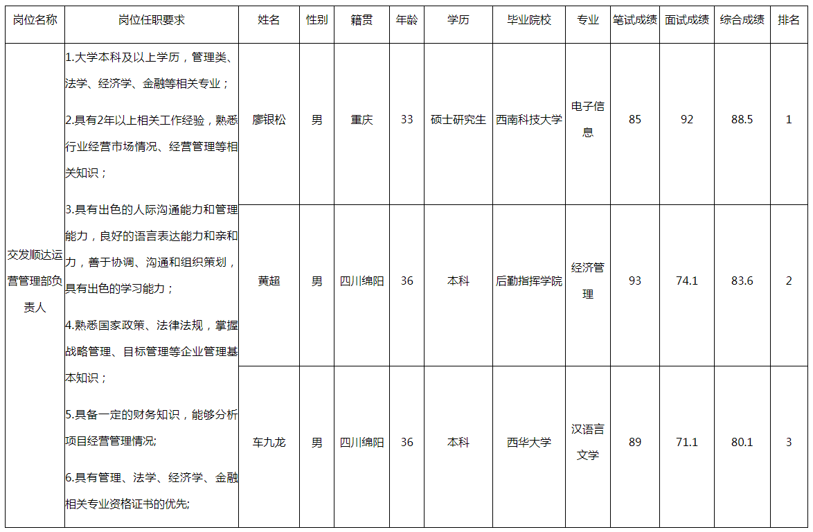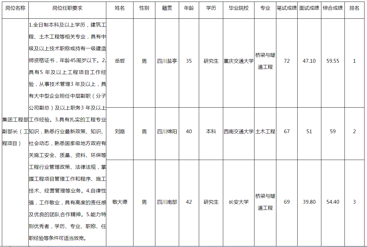 根據(jù)綿陽市國資委發(fā)布的面向全國選聘20名國企經(jīng)營管理人員的公告及相關規(guī)定,對11個達到開考比例的崗位應聘人員組織能力測試、面試(另有9個崗位未達到開考比例終止競聘),現(xiàn)將各應聘人員成績予以公示。
