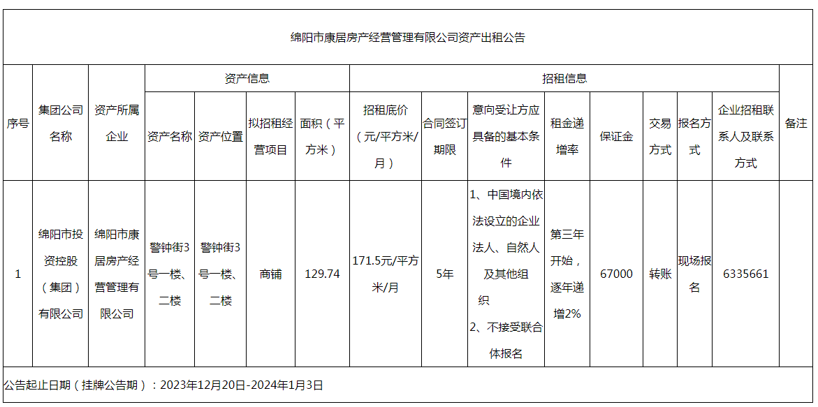 綿陽市康居房產(chǎn)經(jīng)營管理有限公司資產(chǎn)出租公告