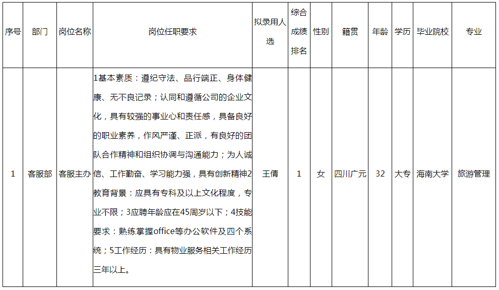 根據(jù)四川長虹物業(yè)服務有限責任公司綿陽分公司發(fā)布的招聘公告及招聘相關(guān)規(guī)定,經(jīng)筆試、面試、考察、體檢等程序,擬錄用王倩同志到仙海創(chuàng)新園管理處工作?,F(xiàn)予以公示,具體情況如下: