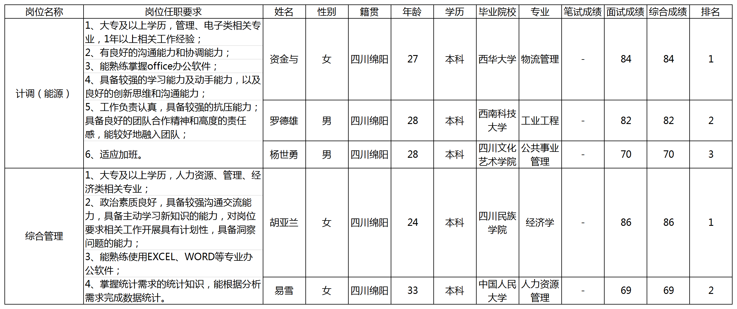 根據(jù)四川九州電子科技股份有限公司發(fā)布的招聘公告及招聘相關(guān)規(guī)定,經(jīng)筆試、面試等程序,現(xiàn)將筆試(面試)成績(jī)予以公示。