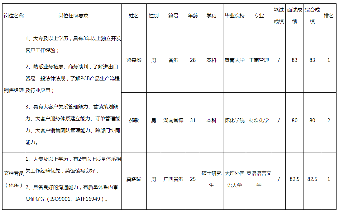 根據(jù)廣東依頓電子科技股份有限公司發(fā)布的招聘公告及招聘相關規(guī)定,經(jīng)筆試、面試等程序,現(xiàn)將筆試(面試)成績予以公示。