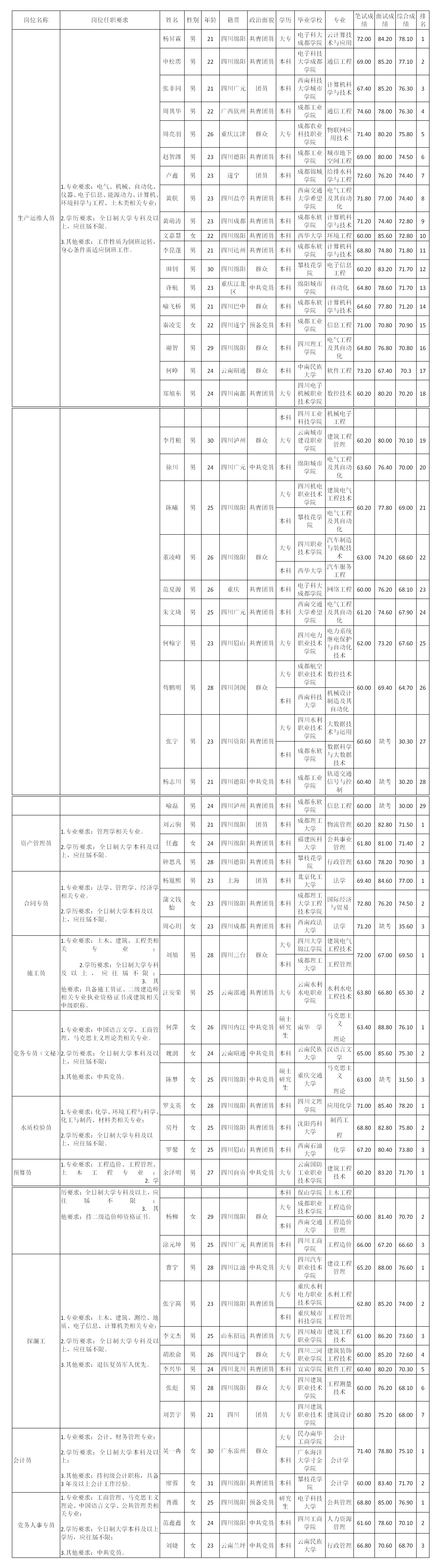 根據(jù)綿陽市水務(集團)有限公司發(fā)布的招聘公告及招聘相關規(guī)定,經(jīng)筆試、面試等程序,現(xiàn)將筆試(面試)成績予以公示。