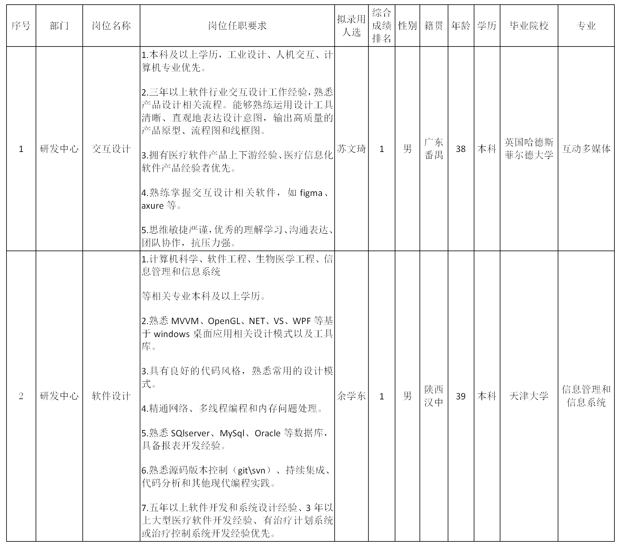 根據(jù)中玖閃光醫(yī)療科技有限公司發(fā)布的招聘公告及招聘相關(guān)規(guī)定,經(jīng)過篩選、面試、體檢等程序,擬錄用蘇文琦、余學(xué)東同志到中玖閃光醫(yī)療科技有限公司工作,現(xiàn)予以公示,具體情況如下: