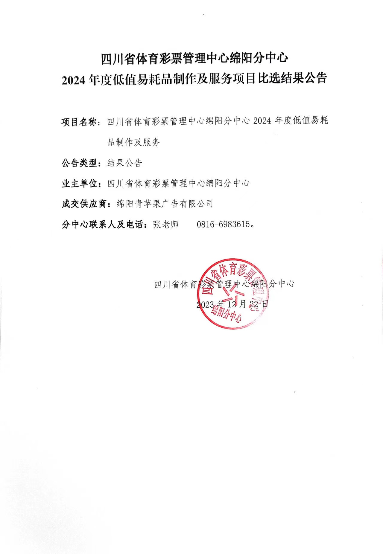 四川省體育彩票管理中心綿陽分中心2024年度低值易耗品制作及服務(wù)項目比選結(jié)果公告